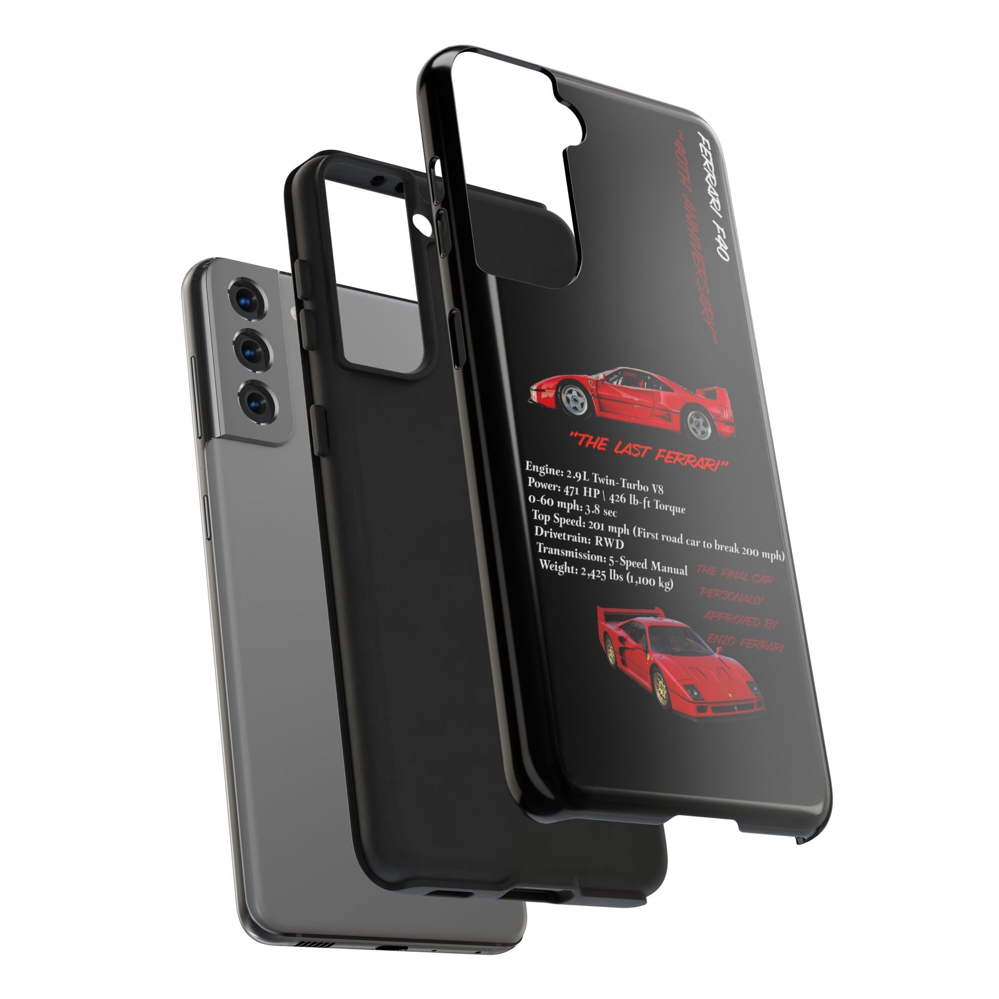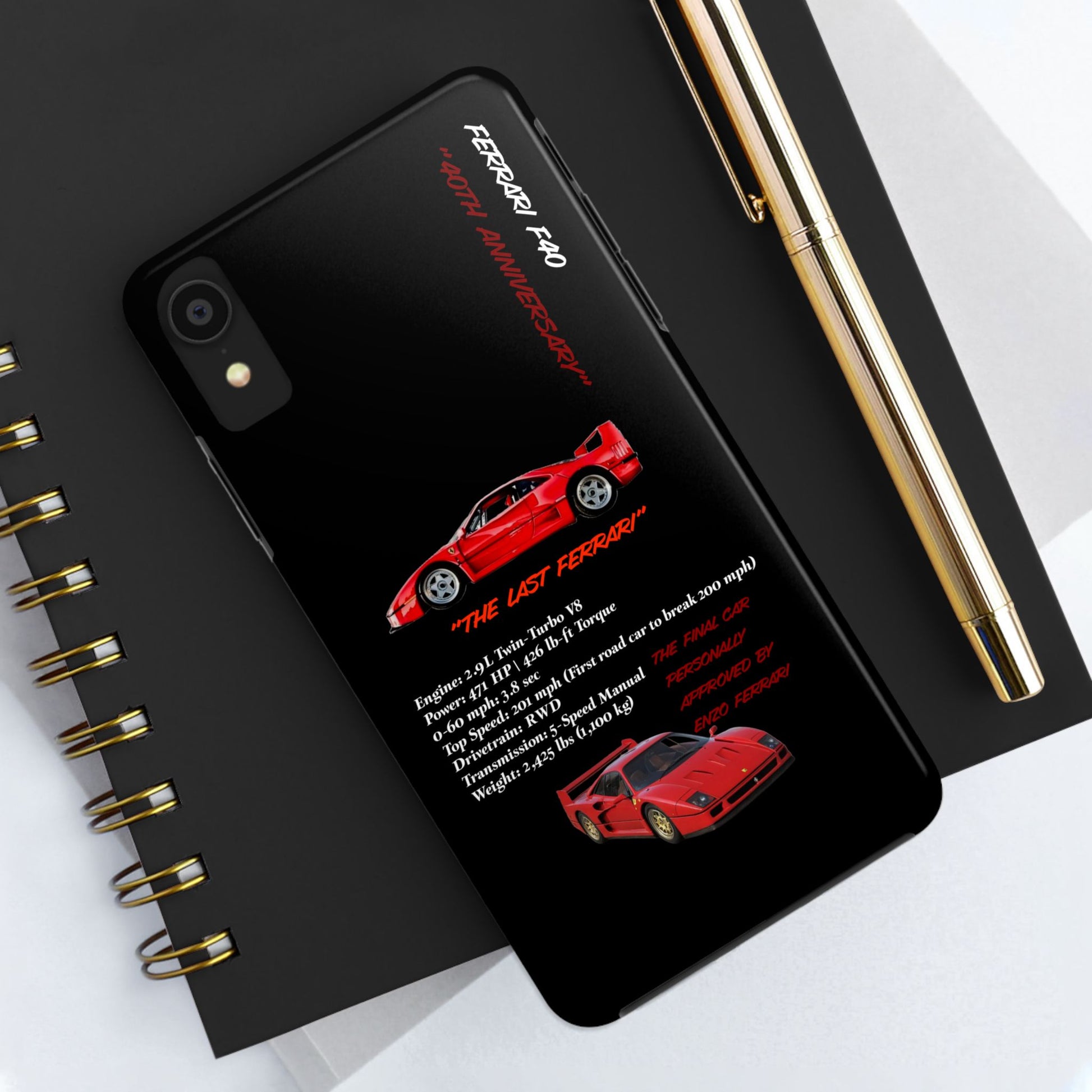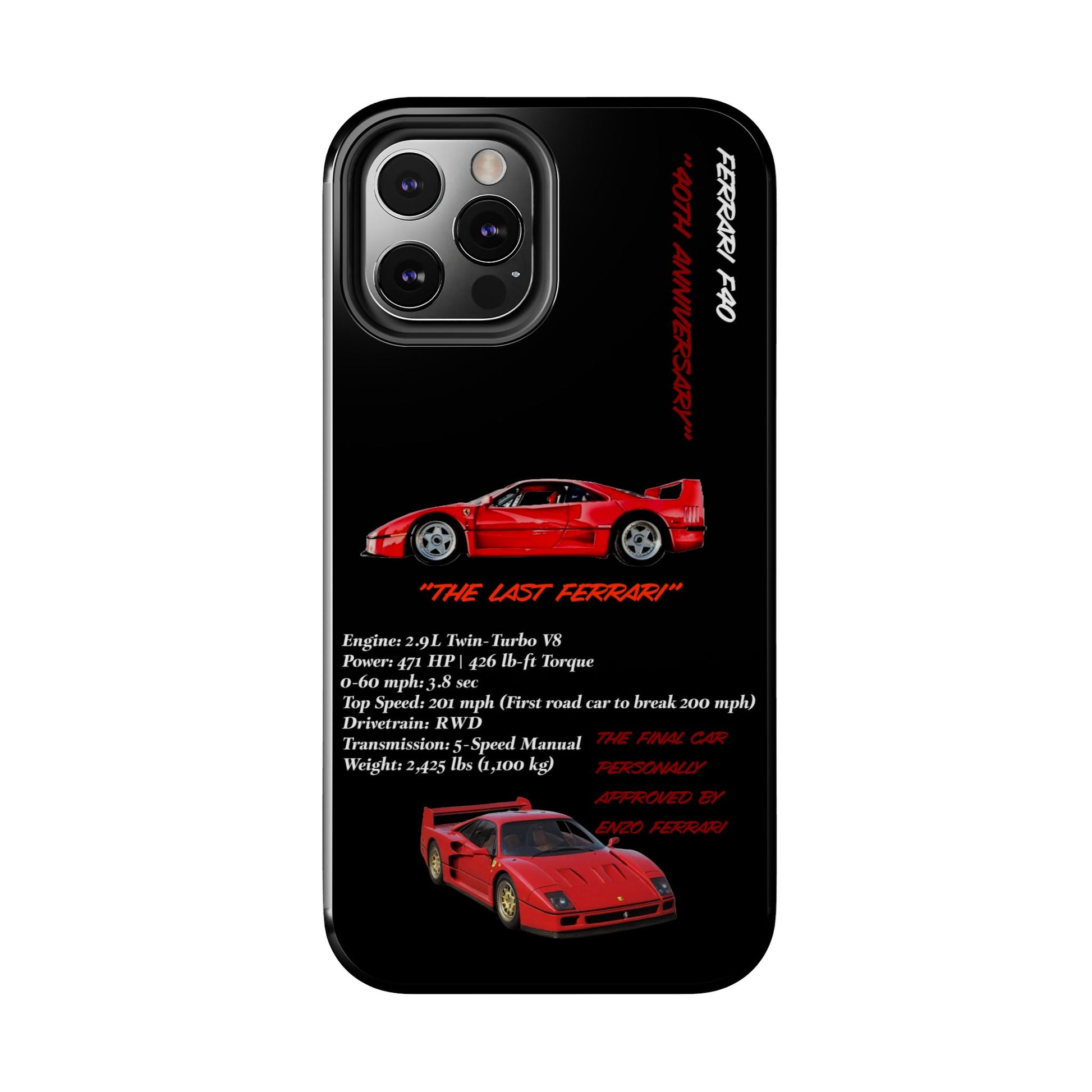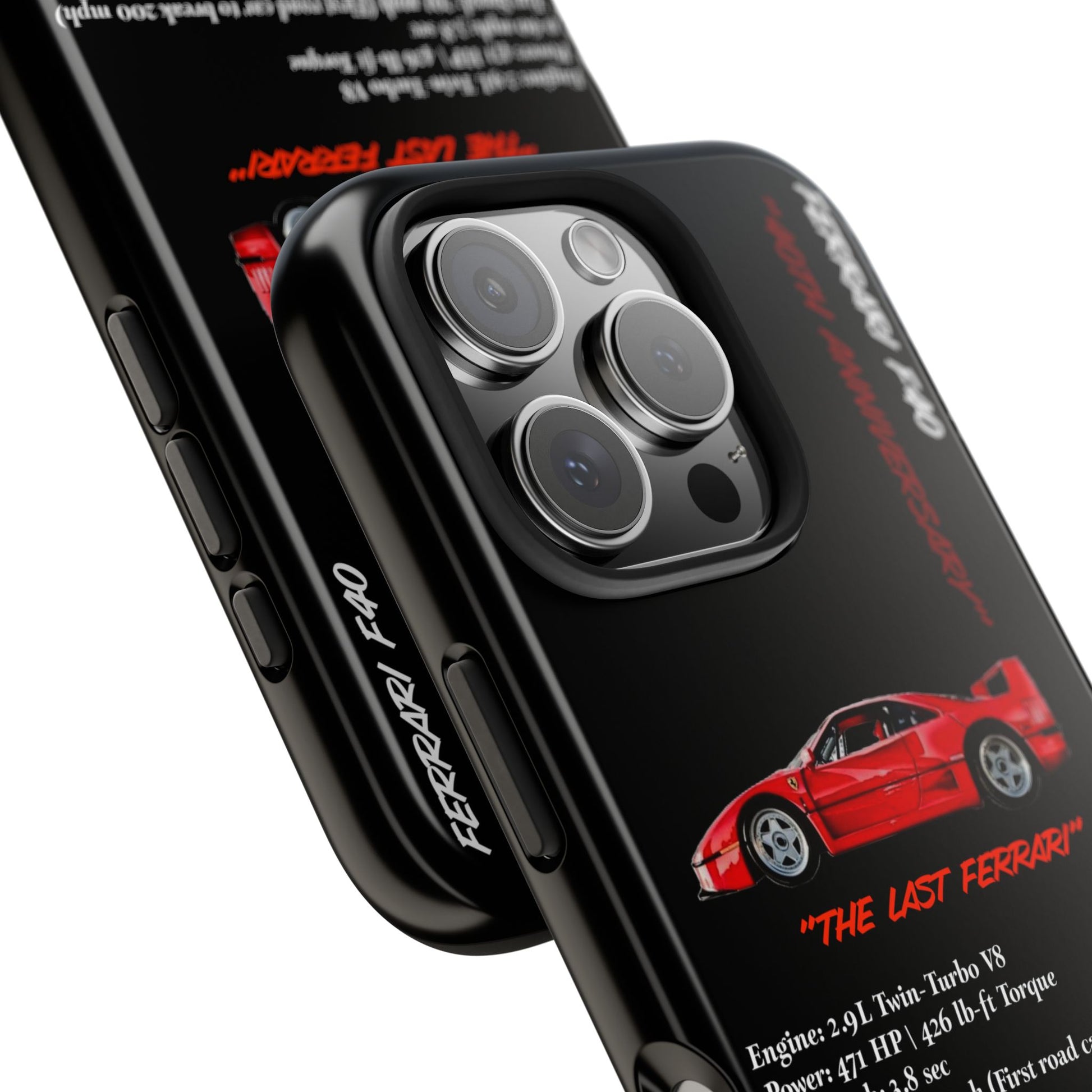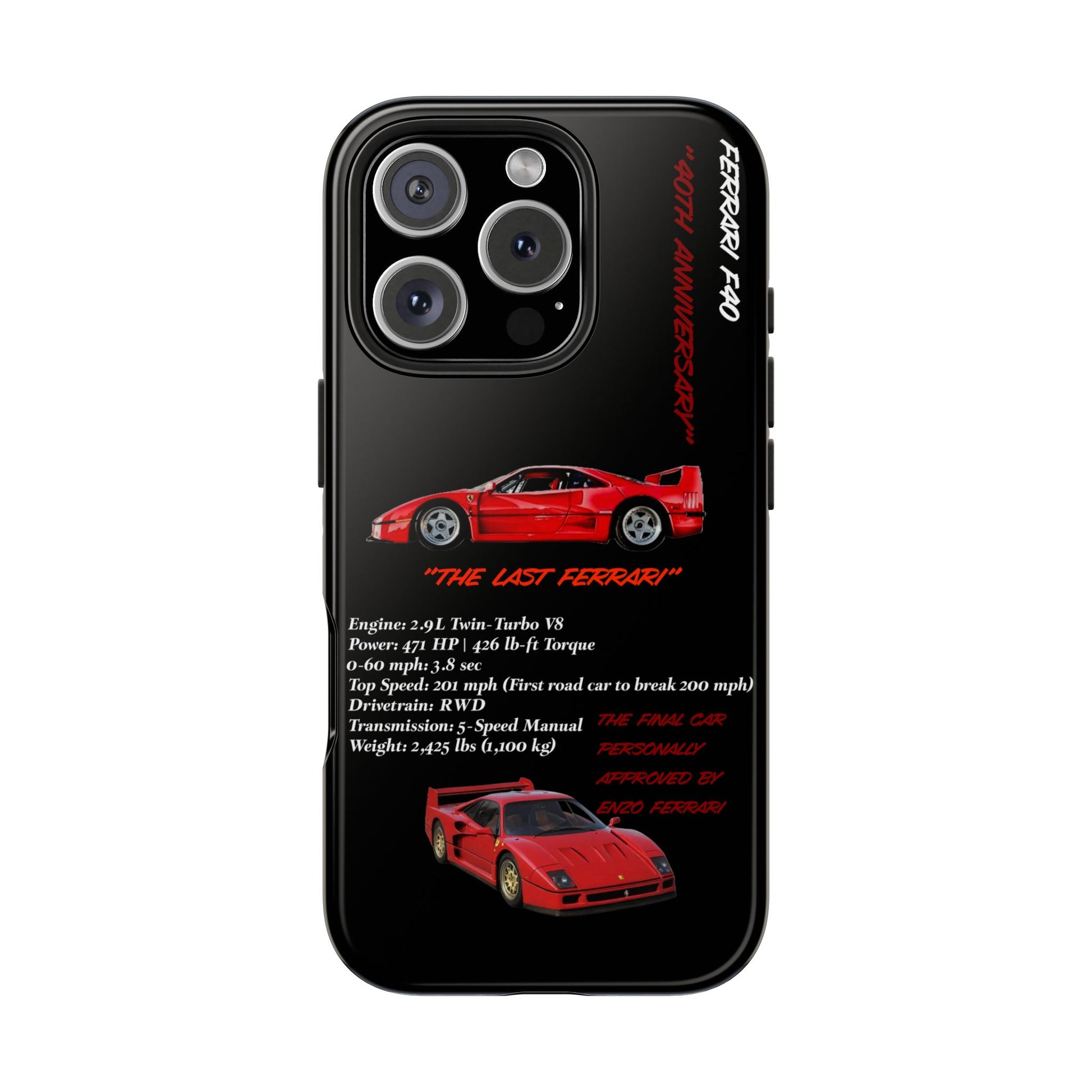 Celebrate the raw power and timeless design of the Ferrari F40 with this Twin-Turbo Legend Edition phone case. Designed for enthusiasts who appreciate lightweight performance, racing heritage, and the last Ferrari personally approved by Enzo Ferrari. Perfect for car enthusiasts and those who love high-performance vehicles. Ideal for gifting on birthdays, Father's Day, and Christmas.